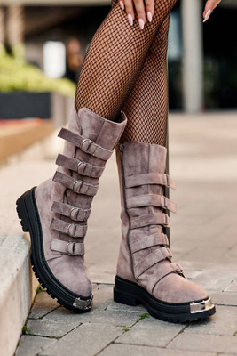+2Zamszowe Wysokie Botki Workery Z Paskami Ciemnobeżowe Elnatea