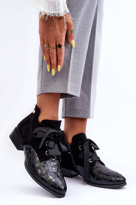 +1Zamszowe Botki Damskie Z Wiązaniem Czarne Lineanor
