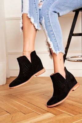 +3Botki Damskie Płaski Obcas Zamszowe Ażurowe Czarne Shades
