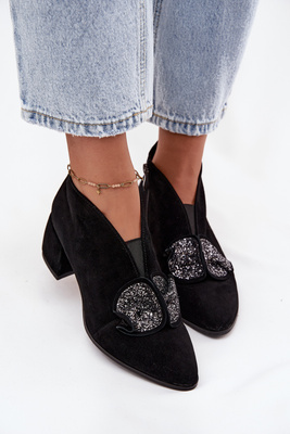 Skórzane Zamszowe Botki Damskie Na Obcasie Z Ozdobą D&A MR52-182 Czarne