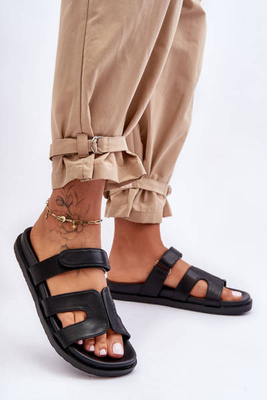 +3Skórzane Klasyczne Klapki Damskie Na Rzep Czarne Amedon