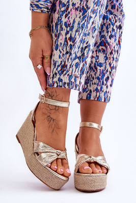 Klasyczne Skórzane Sandały Na Koturnie Złote Denisse