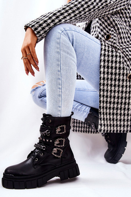 Botki Wiązane Łańcuch Sprzączka Czarne Reiloy