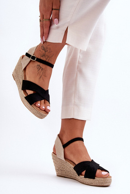 Damskie Zamszowe Sandały Na Plecionym Koturnie Czarne Tessa