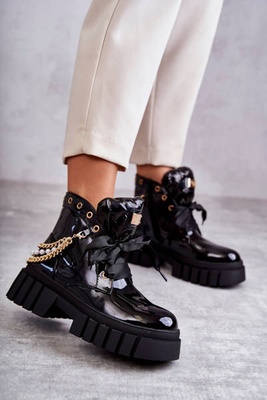 Lakierowane Ocieplane Botki Z Łańcuszkiem Czarne Karoline