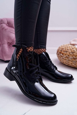 +1Botki Damskie Płaski Obcas Lakierowane Czarne Nicole 2420