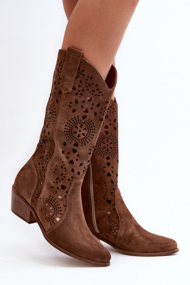 +1Pokaż filmZazoo 3305/P Zamszowe Kozaki Do Połowy Łydki Ażurowe Brązowe