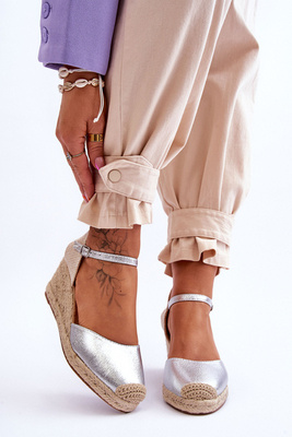 Skórzane Sandałki Espadryle Na Koturnie Srebrne Cammer