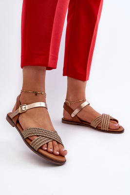 Eleganckie Sandały Damskie Ze Złotą Ozdobą Na Płaskim Obcasie Złote S.Barski KV27-053