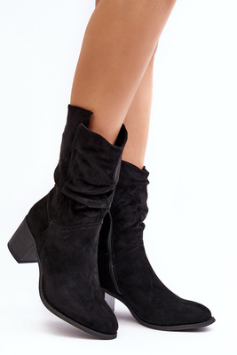 +1Botki Damskie Ocieplane Z Marszczoną Cholewką Na Słupku Czarne Shavy