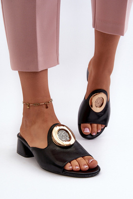 +1Eleganckie Klapki Damskie Na Niskim Obcasie Ze Złotą Ozdobą Czarne Uzimila