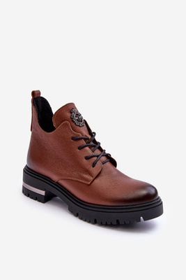 +4Damskie Skórzane Botki Na Płaskim Obcasie Brązowe Lemar Charline