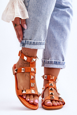 +2Skórzane Damskie Sandały Z Dużymi Ćwiekami Pomarańczowe Mishigan