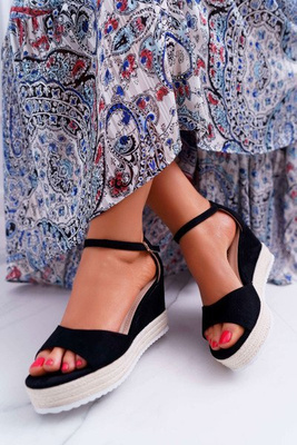Sandały Damskie Na Koturnie Platformie Zamszowe Czarne Delima