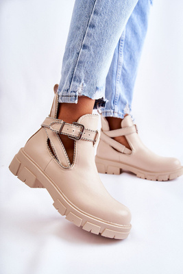 Skórzane Botki Wycięcie Pasek Beżowe Rosanne