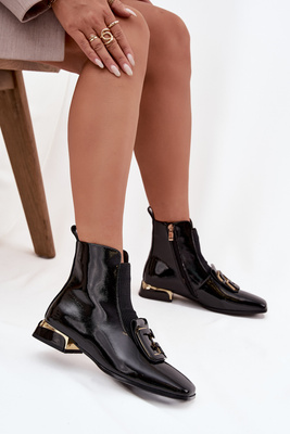+1Skórzane Lakierowane Botki Damskie Na Niskim Obcasie Z Ozdobą D&A MR52-216 Czarne