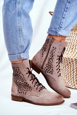 +3Botki Damskie Płaski Obcas Zamszowe Ażurowe Cappuccino Shades