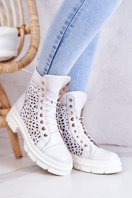 Botki Trapery Skórzane Beżowo-Białe Letty