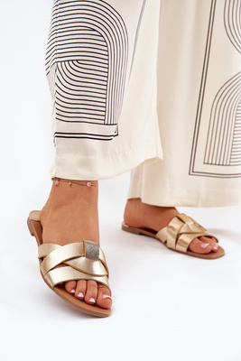 Eko Skórzane Płaskie Klapki Damskie Z Ozdobnym Detalem Złote Frelie