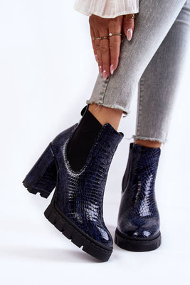 +1Lakierowane Botki Wężowy Wzór Na Słupku Granatowe Eldey