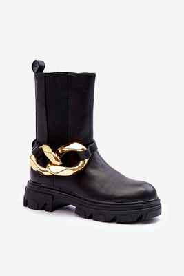 Modne Skórzane Botki Sztyblety z Łańcuchem Czarne Kambiz