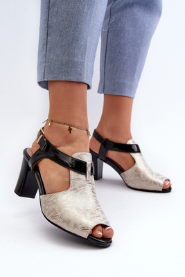 Sandały Damskie Na Słupku Z Eko Skóry Złoto-Czarne Queenmarie