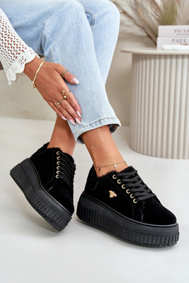 Sneakersy Damskie Ocieplane Na Masywnej Podeszwie Ze Złotym Detalem Czarne Lotira