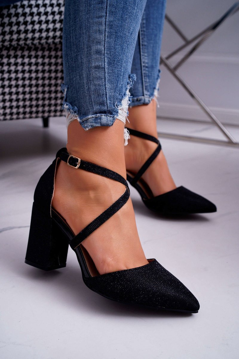 Czółenka Damskie Na Słupku Brokatowe Czarne Trever