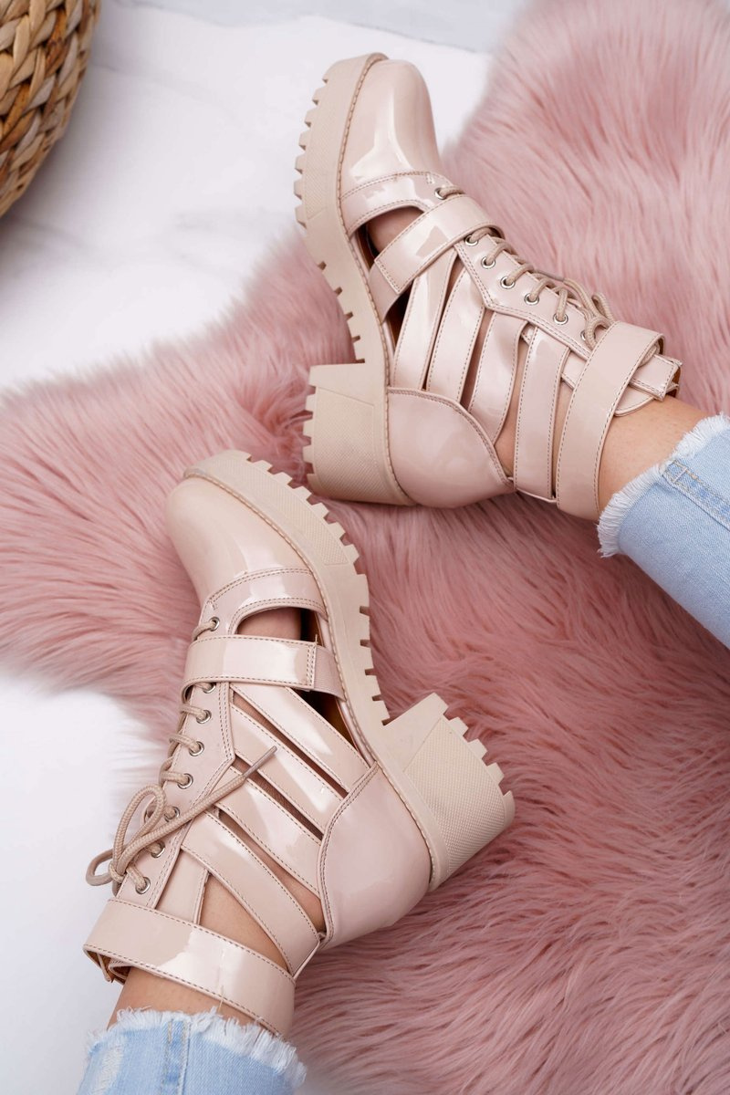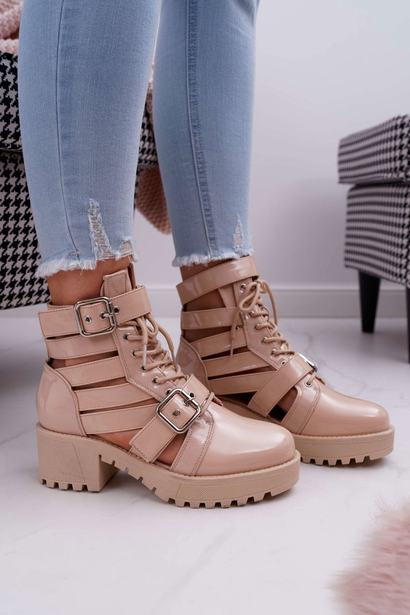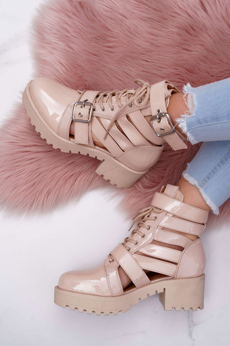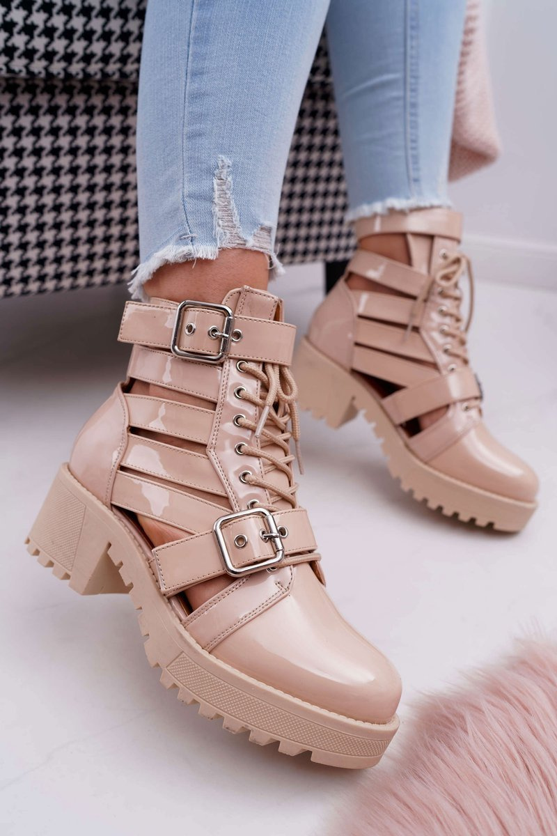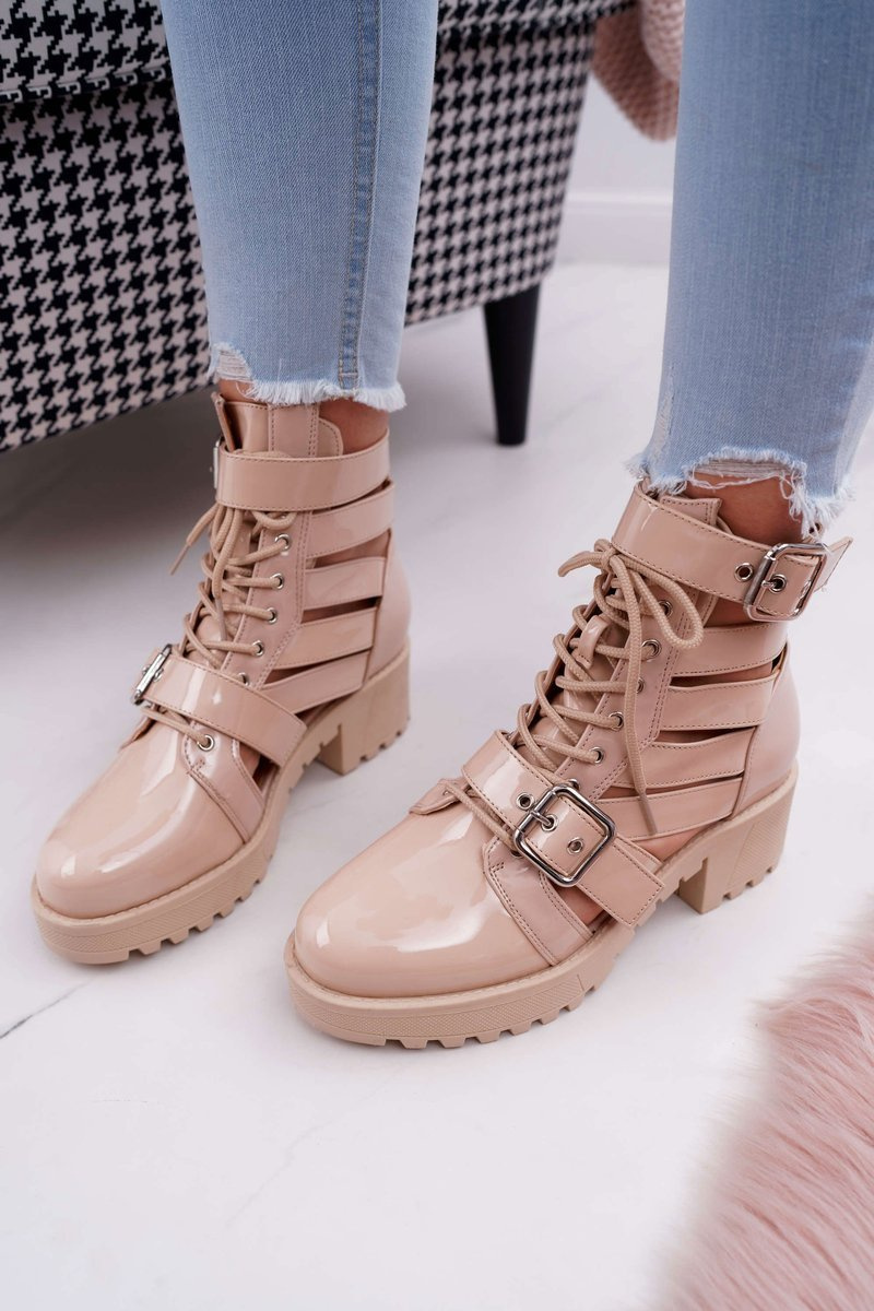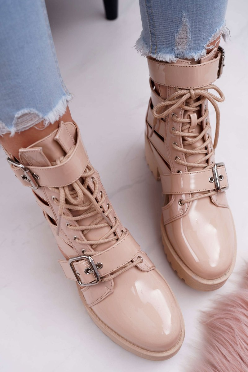 Botki Damskie Płaski Obcas Wiosenne Lakierowane Beżowe Single