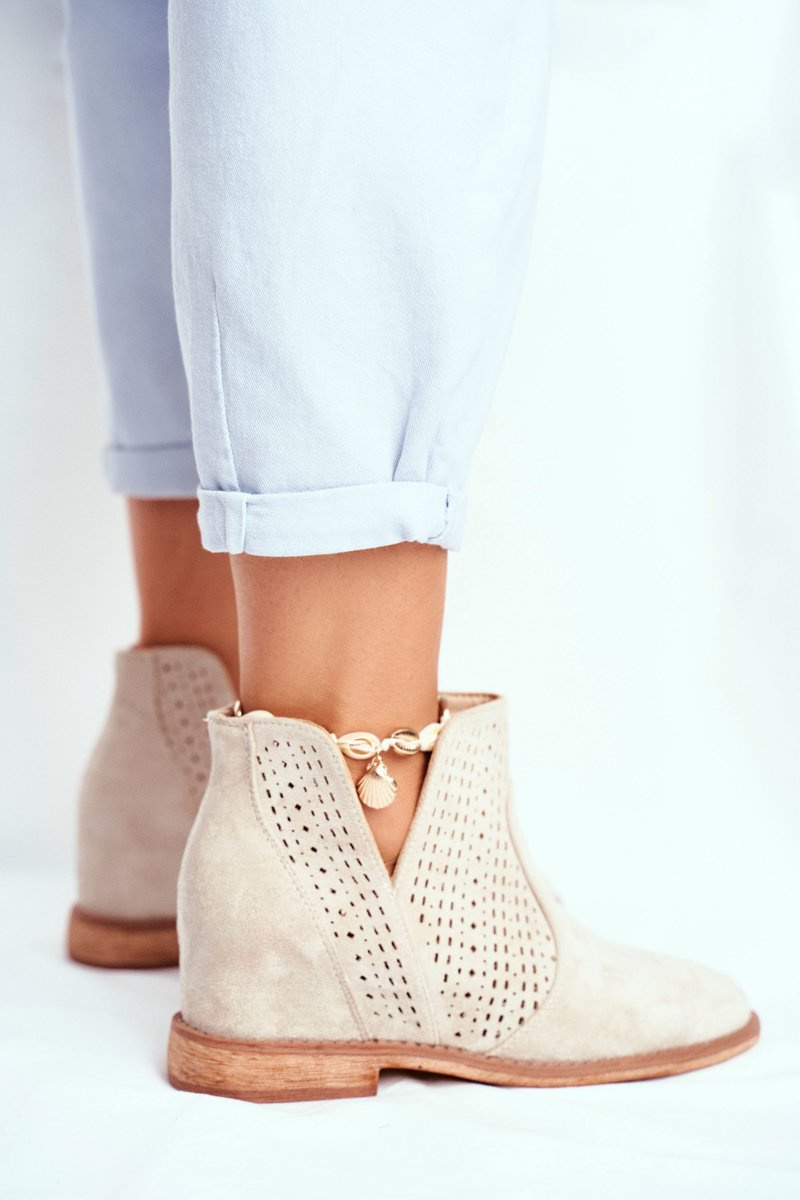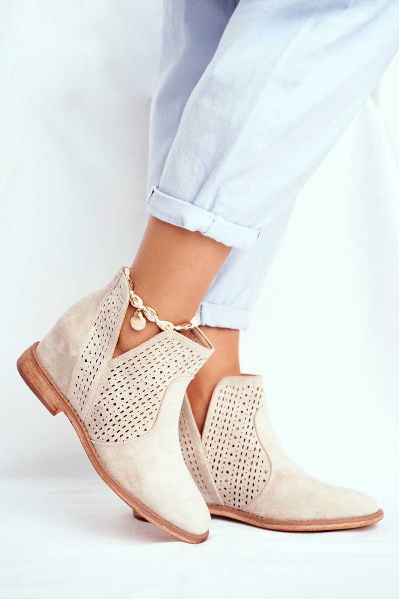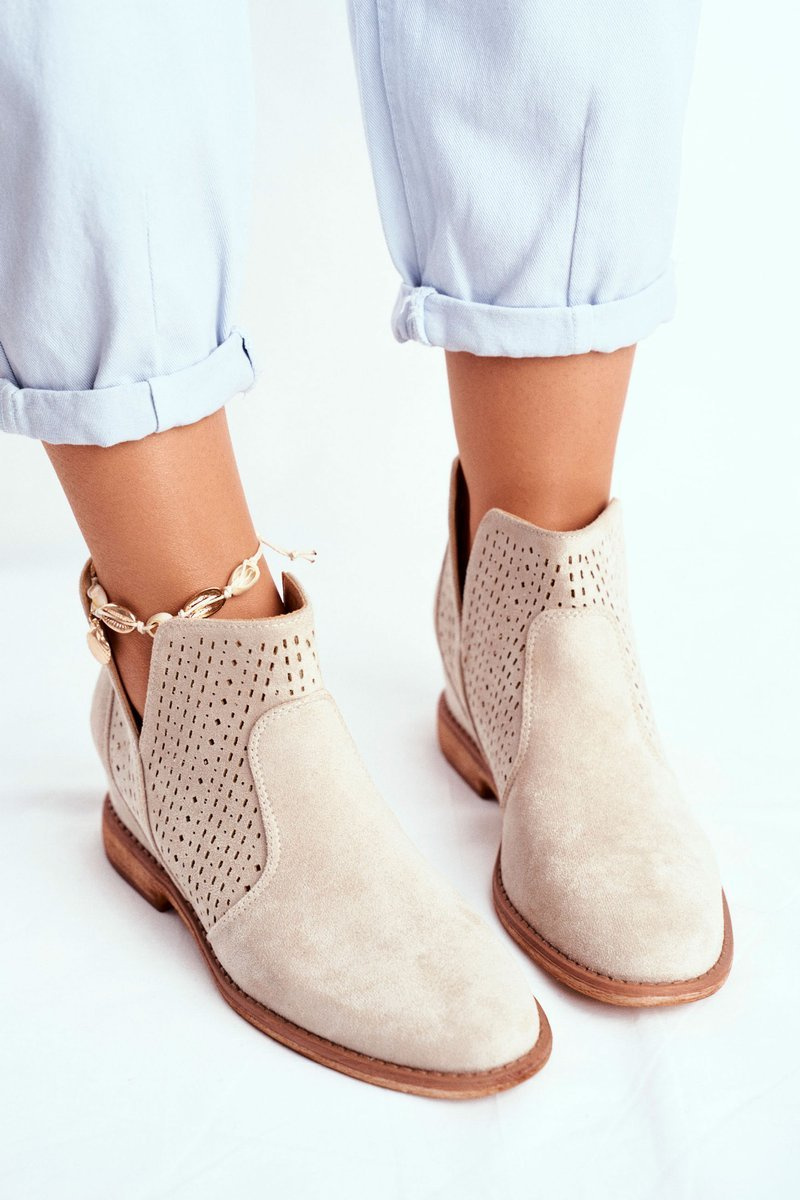 Botki Damskie Płaski Obcas Zamszowe Ażurowe Cappuccino Shades