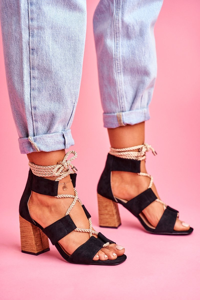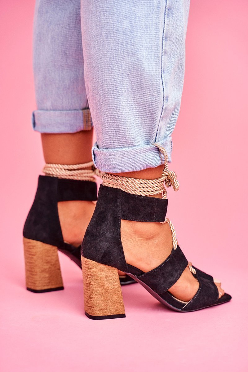 Sandały Damskie Na Słupku Wiązane Zamszowe Czarne Amore