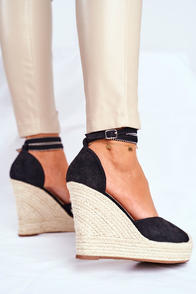 Sandały Damskie Na Koturnie Lniane Czarne Canterola