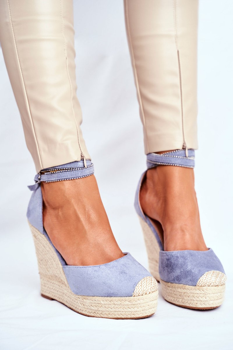 Sandały Damskie Na Koturnie Lniane Niebieskie Canterola
