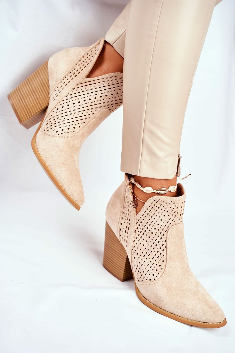 Botki Damskie Na Słupku Zamszowe Ażurowe Jasno Beżowe Shades
