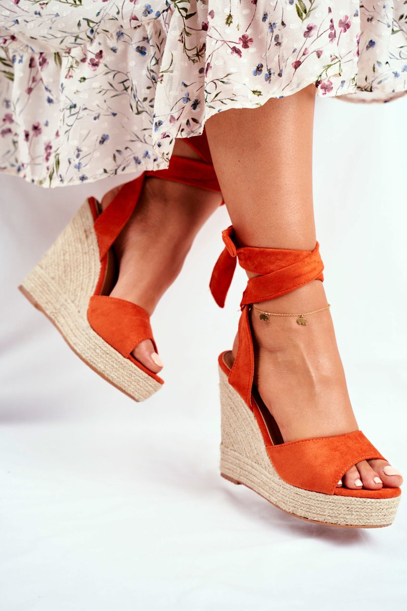 Sandały Damskie Na Koturnie Wiązane Pomarańczowe Belleza