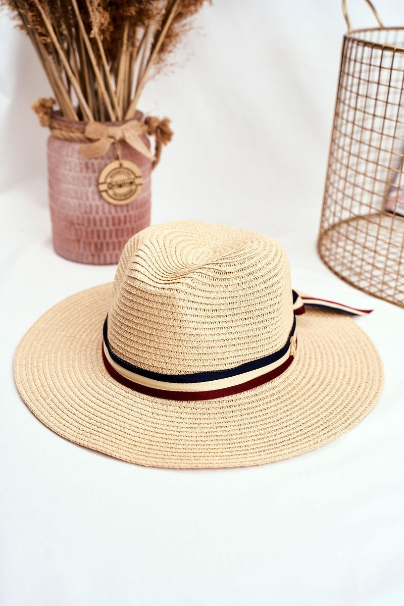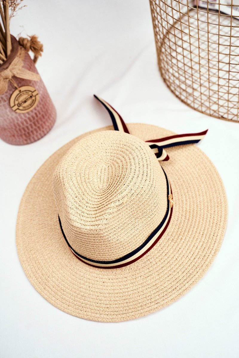 Damski Kapelusz Panama 100% Papier Beżowy Wstążka Złota Mucha