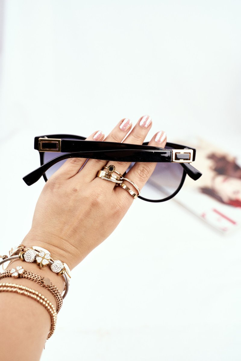 Okulary posiadają szkła z pięknym gradientem czerni oraz modne ozdoby na zausznikach widoczne na zdjęciach.Zdjęcia są naszego autorstwa i przedstawiają sprzedawany produkt.