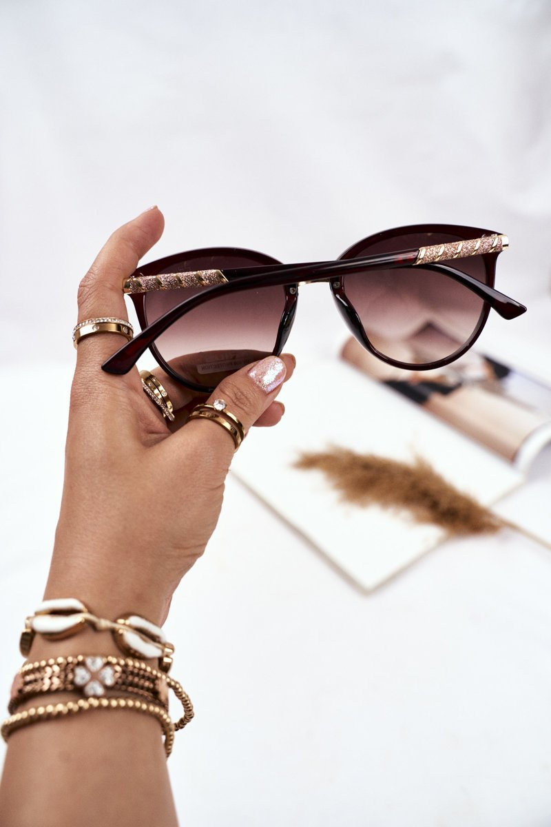 Okulary posiadają szkła z pięknym gradientem brązu oraz modne ozdoby na zausznikach widoczne na zdjęciach.