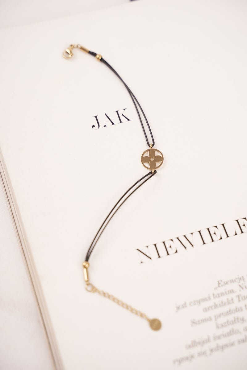 Damska Bransoletka Czarny Sznurek Celebrytka Złota Koniczynka Clara