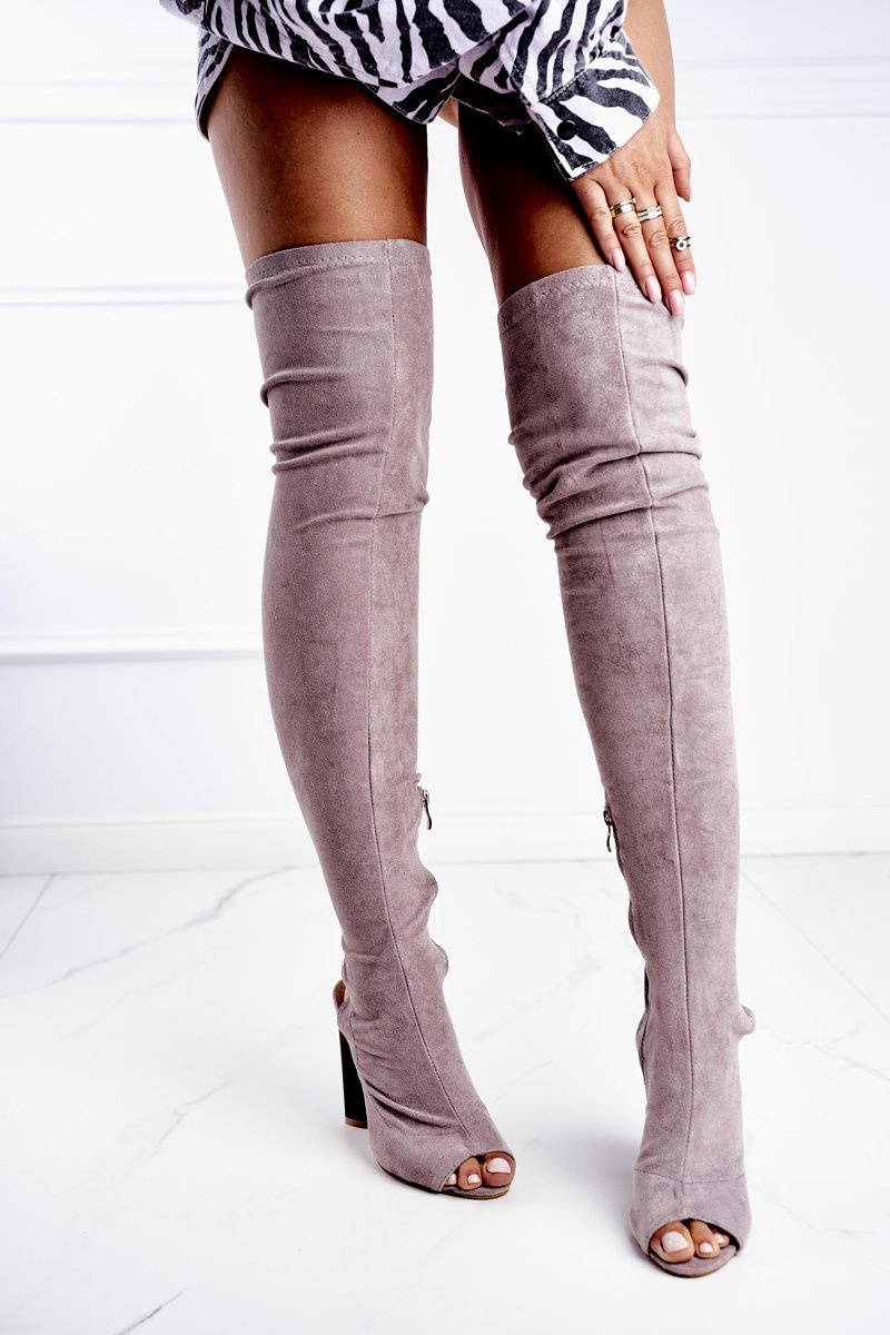 Nowy sezon już niedługo lecz poza słonecznymi dniami z pewnością zdarzą się te nieco chłodniejsze. Dlatego na takie sytuacje odpowiednie będą nasze wysokie muszkieterki sięgające powyżej kolana. Delikatny zamszowy materiał oraz zapinanie na zamek to gwarancja wyszukanego stylu. Model na wysokim słupku wraz z odkrytą piętą i palcami będzie świetnie się komponował z eleganckimi stylizacjami. Idealne kozaki dla prawdziwych dam!