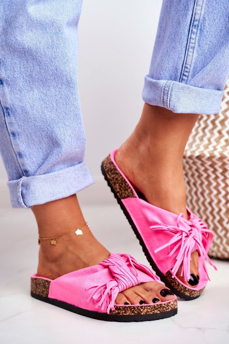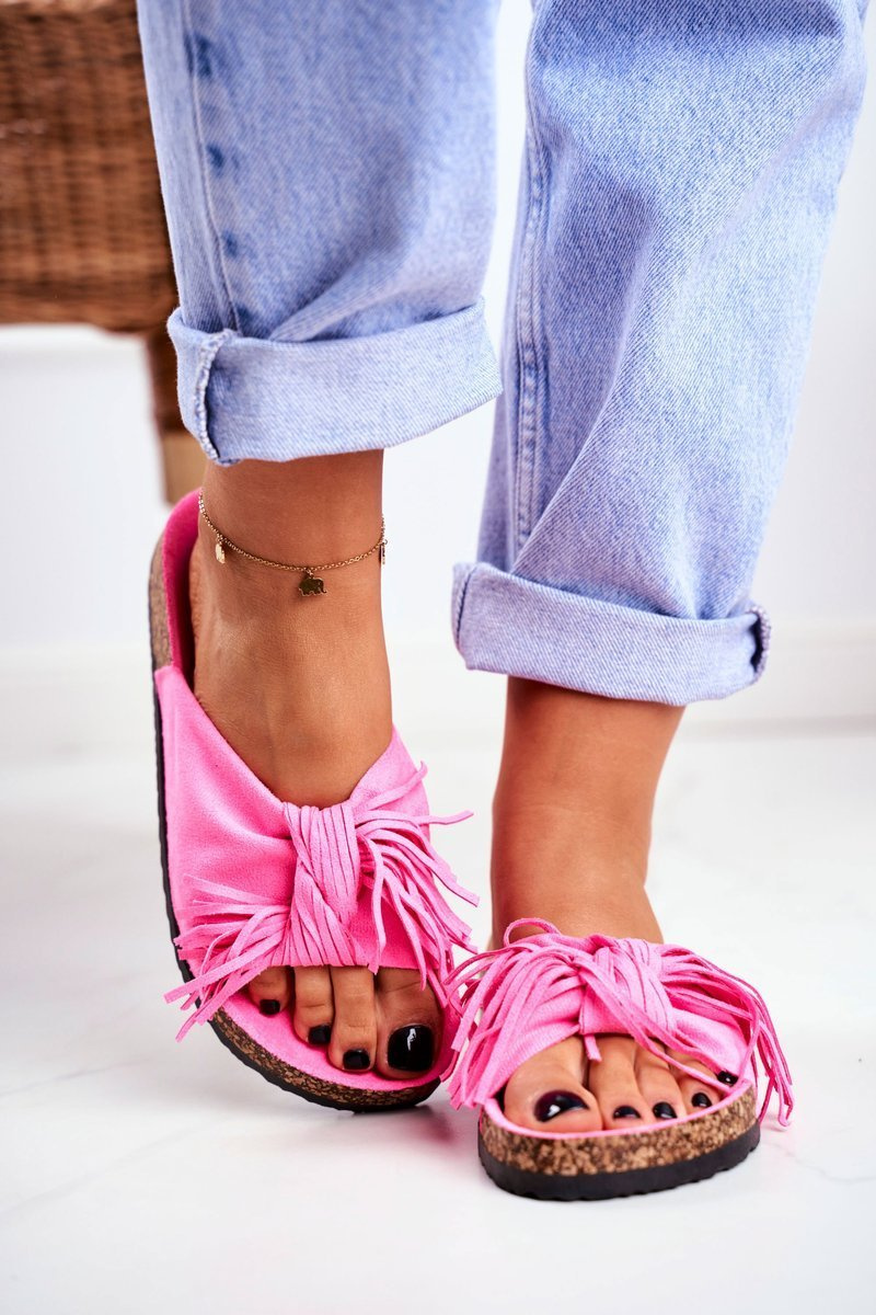 Damskie Różowe Fluo Klapki Na Korku Frędzle Marina