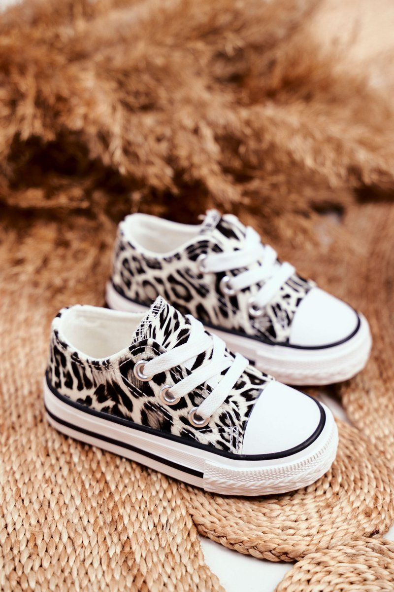Trampki dziecięce ozdobione lamparcim wzorem. Buty dobrze dopasowują się do kształtu stopy dzięki miękkiej, materiałowej cholewce. Trampki posiadają antypoślizgową podeszwę. Koniecznie sprawdź całą naszą kolekcję trampek dziecięcych! Przy wyborze rozmiaru prosimy sugerować się tabelą rozmiarów.