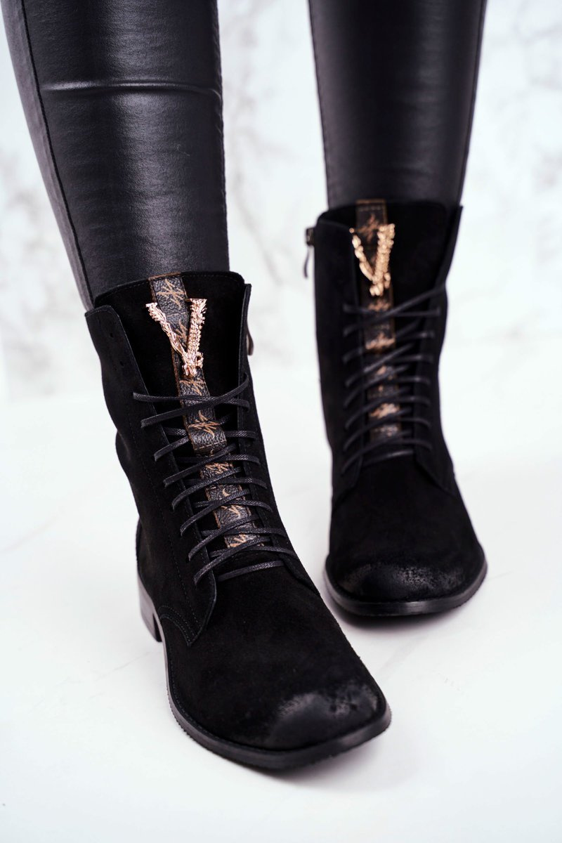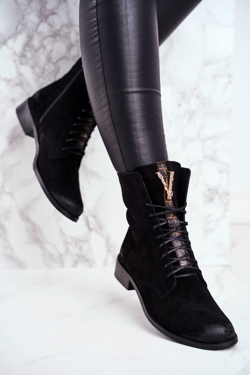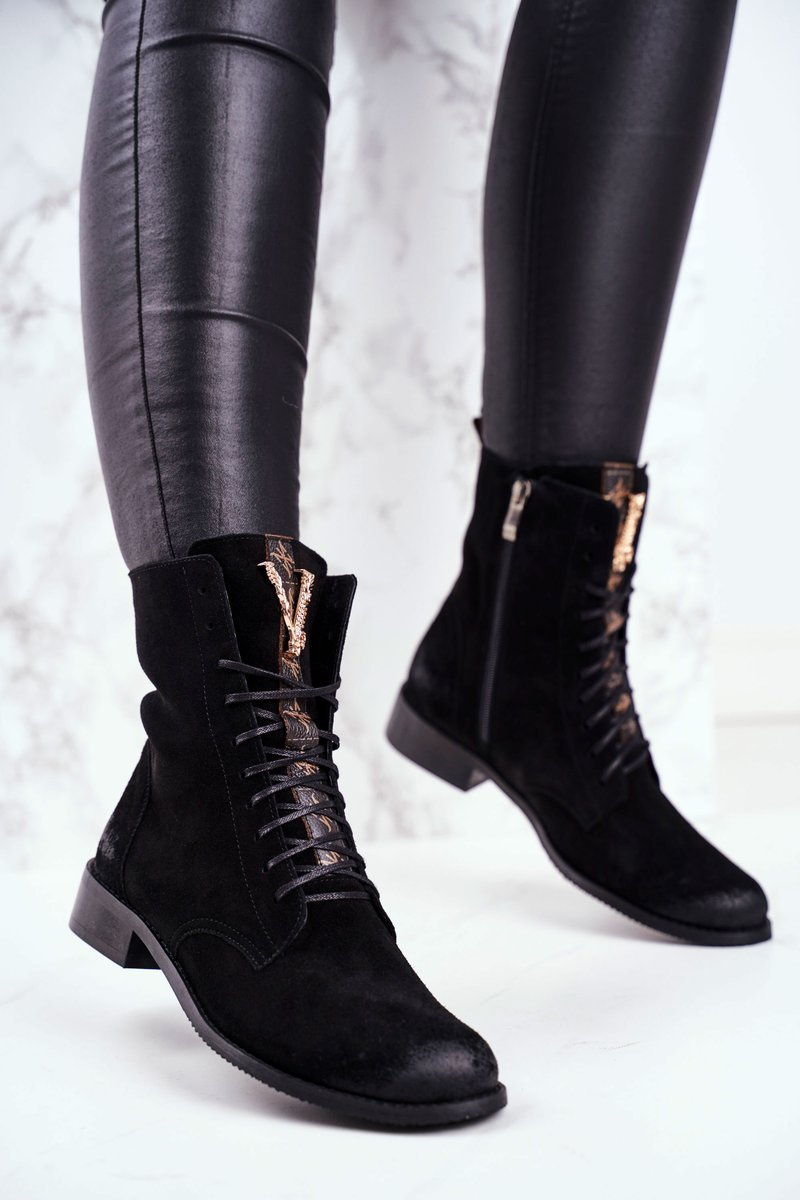 Botki to nie tylko buty na chłodne dni. Świetnie sprawdzą się również podczas tworzenia wiosennych stylizacji. Buty zostały wykonane z naturalnej skóry nubukowej. Zdobienie w postaci złotej literki V wygląda przepięknie i podkreśla ich stylistykę. Zakładanie ułatwi wszyty na boku suwak, natomiast o lepsze dopasowanie zadbają sznurowadła. Botki oparte na delikatnym płaskim obcasie. Przy wyborze rozmiaru prosimy sugerować się tabelą rozmiarów.