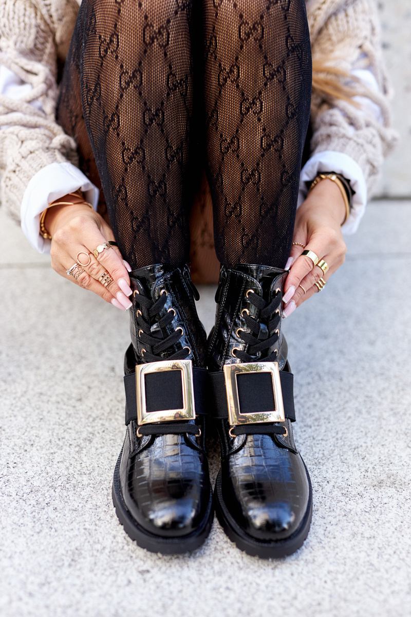 Czy może nas coś jeszcze zaskoczyć? Oczywiście! Spójrz na te przepiękne botki! Botki wykonane ze skóry ekologicznej, wewnątrz ocieplone kocem obuwniczym z krótkim włosiem, więc o ciepło w chłodnie dni nie musisz się martwić. Płaski obcas, wysoka cholewka z imitacją skóry, połączona z klamrą. - botki świetnie wpiszą się w stylizacje jesienno-zimowe stylizacje. Przy wyborze rozmiaru prosimy sugerować się tabelą rozmiarów.
