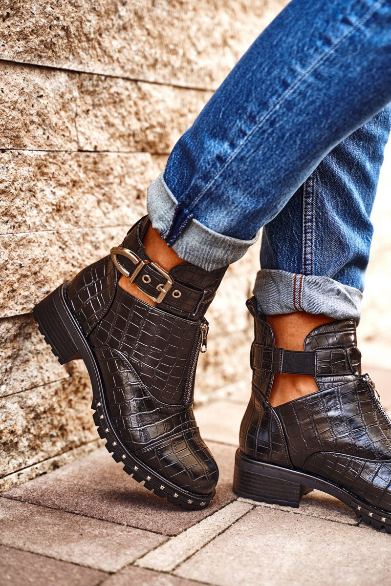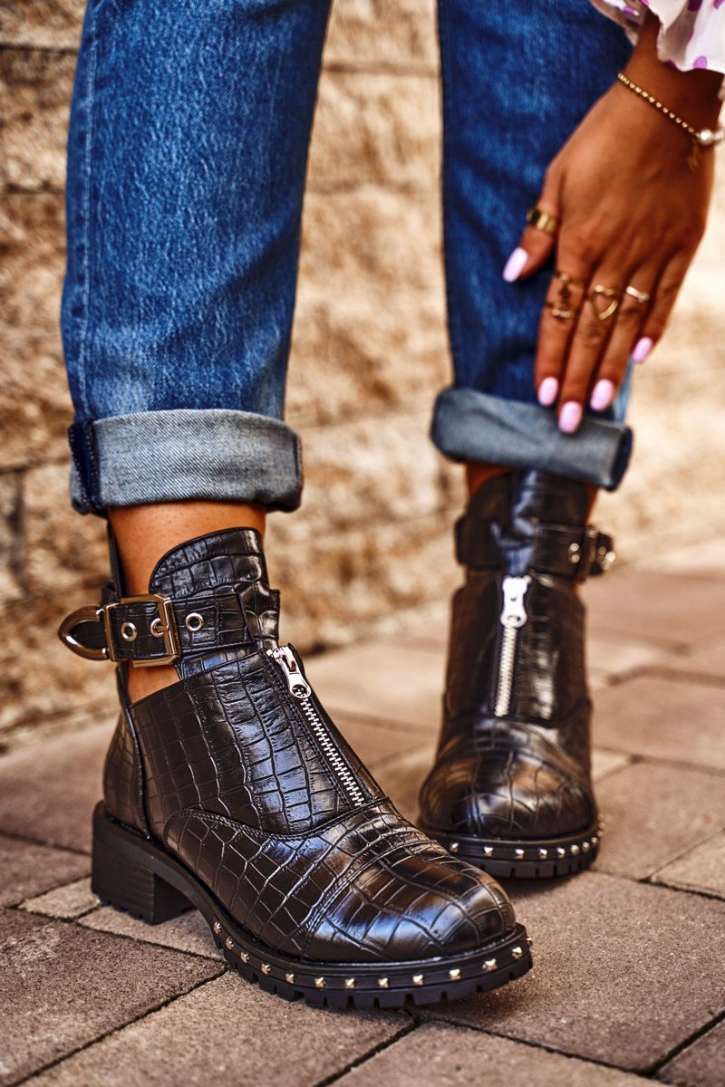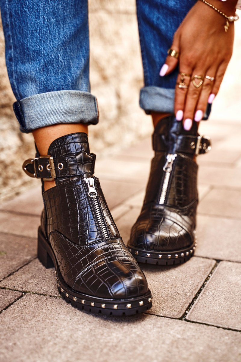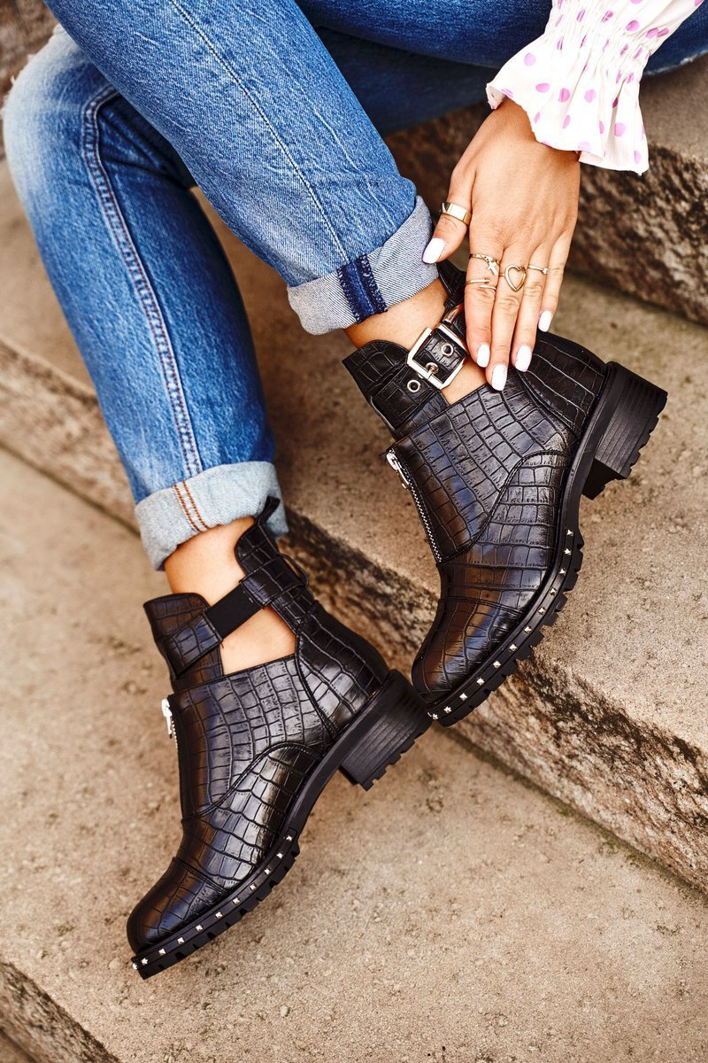 Jeśli chcesz zabłysnąć w świecie mody lub po prostu pokazać się z jak najlepszej strony, to te botki będą idealną propozycją dla Ciebie. Bardzo wyczekiwane przez wiele kobiet! Wyglądają bardzo efektownie, zastosowanie regulowanej klamry na boku oraz suwaka na przedniej części cholewki to strzał w 10! Wierzch wykonany ze skóry ekologicznej z imitacją krokodylej skóry. Posiadają unikalny design - są częściowo wykrojone na wysokości kostki, przez co wyglądają niesamowicie. Rockowy styl na wyciągnięcie ręki! Wysoka, traktorowa podeszwa idealnie komponuje się z resztą obuwia. Nie czekaj dłużej i kup teraz, póki jeszcze są dostępne! Przy wyborze rozmiaru prosimy sugerować się tabelą rozmiarów.