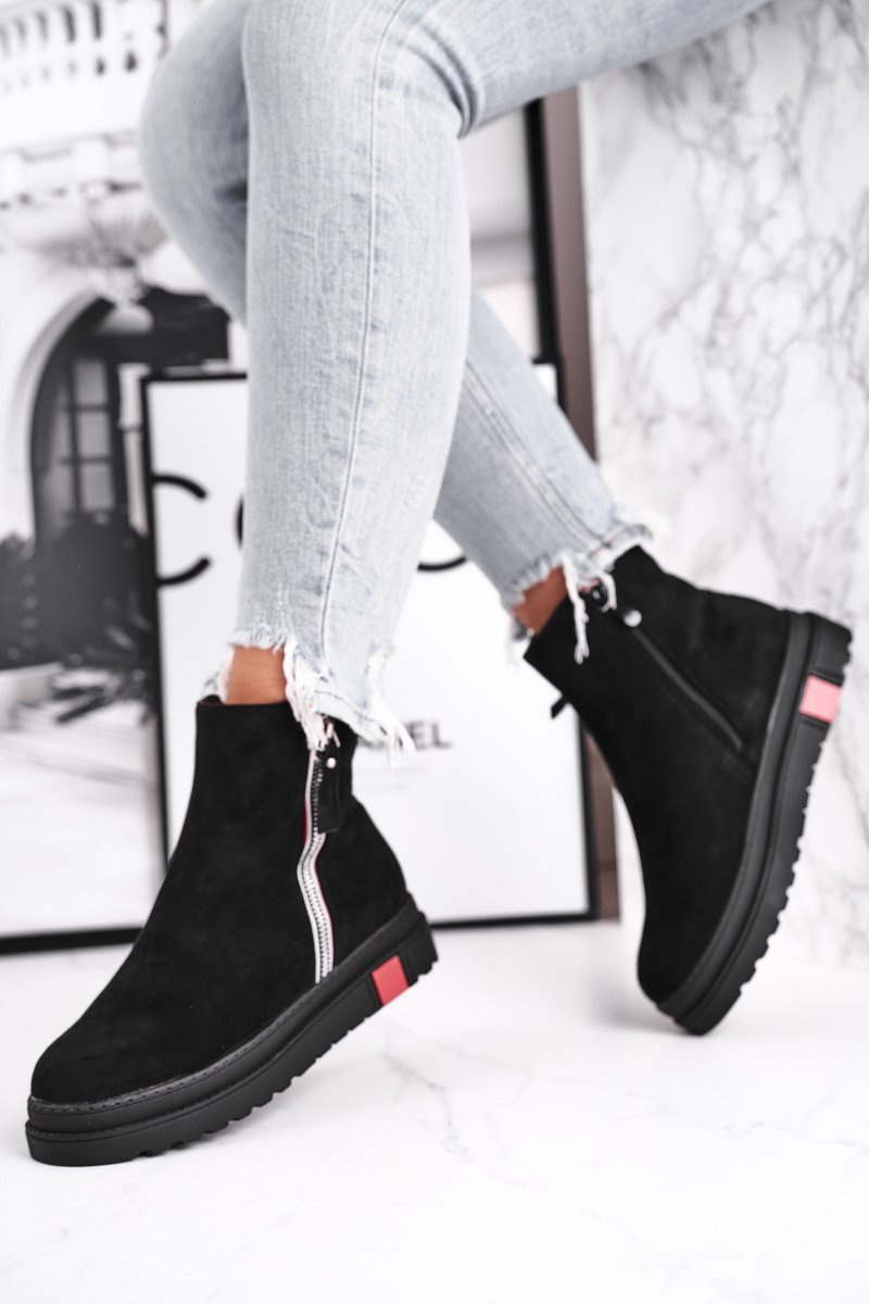 Botki, botki, botki - bez nich nasze jesienno-zimowe stylizacje nie byłby tak cudowne! Prezentowany model wykonany został ze skóry ekologicznej imitującej zamsz. Cholewka zdobiona po zewnętrznej stronie suwakiem. Drugi suwak po wewnętrznej stronie jest praktycznym zastosowaniem ułatwiającym nam zakładanie. Wnętrze buta ocieplone zostało ciepłym i miłym w dotyku kocem obuwniczym. Płaska podeszwa to gwarancja komfortu w każdej codziennej sytuacji. Przy wyborze rozmiaru prosimy sugerować się tabelą rozmiarów.