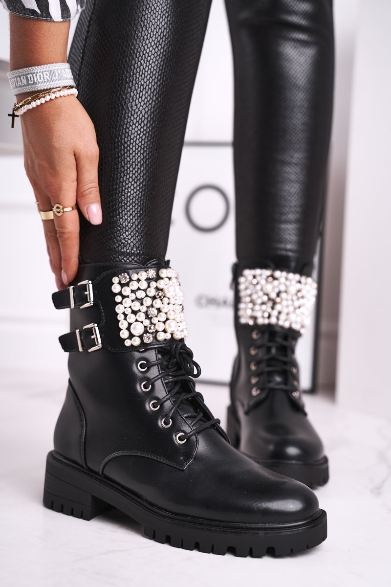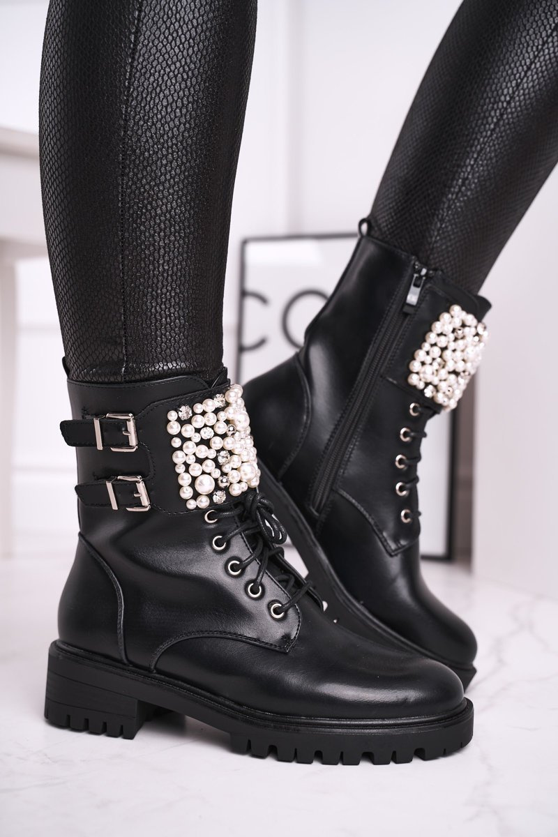 Botki Damskie Płaski Obcas Militarne Czarne Bemmer