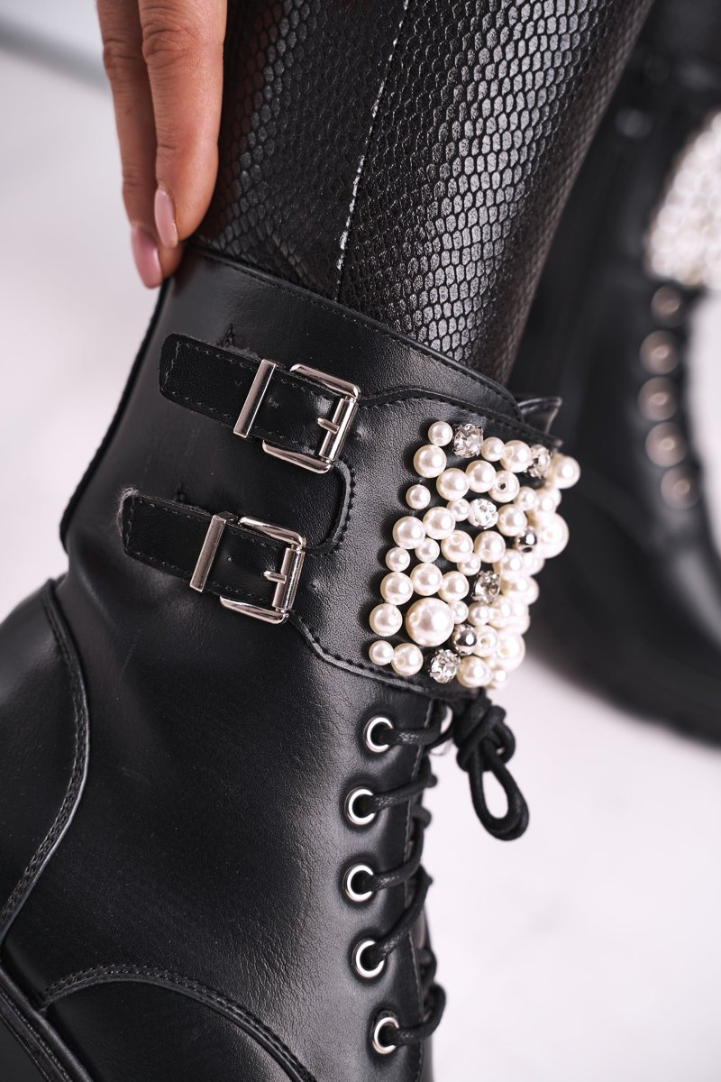 Jeśli tu trafiłaś, to znaczy, że szukasz modnego i wygodnego obuwia na chłodniejsze dni. Wysoka cholewka zapinana na boku z pięknym zdobieniem w postaci perełek oraz cyrkonii. Możliwość lepszego dopasowania dzięki zastosowaniu sznurowadeł, które dzięki ukryciu pod klapą z perełkami tworzą również wspaniałą ozdobę. Środek pokryty jest miłym w dotyku kocem obuwniczym. Lubimy dawać kobietą powód do kupienia nowej pary butów, a te botki to właśnie jeden z nich! Przy wyborze rozmiaru prosimy sugerować się tabelą rozmiarów.