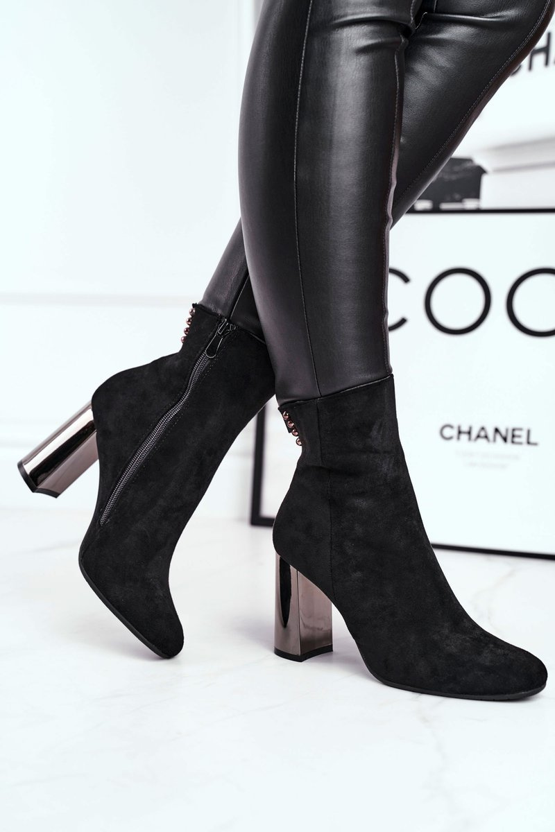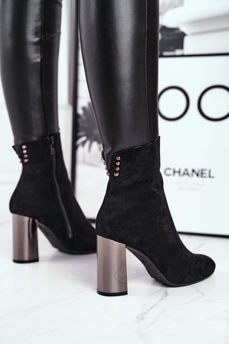 Czarne botki wykonane z przyjemnego w dotyku ekozamszu i lustrzanym obcasem to nasza nowość. Stabilny słupek oraz rozpięcie zamkiem zapewni komfort użytkowania. Rozporek w cholewce dopasowuje się do każdej tęgości, dzięki czemu będzie to doskonały wybór na jesienne czy wiosenne użytkowanie. Przy wyborze rozmiaru prosimy sugerować się tabelą rozmiarów.