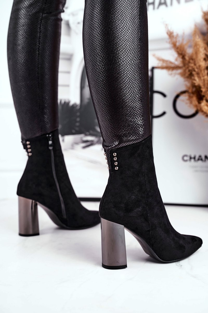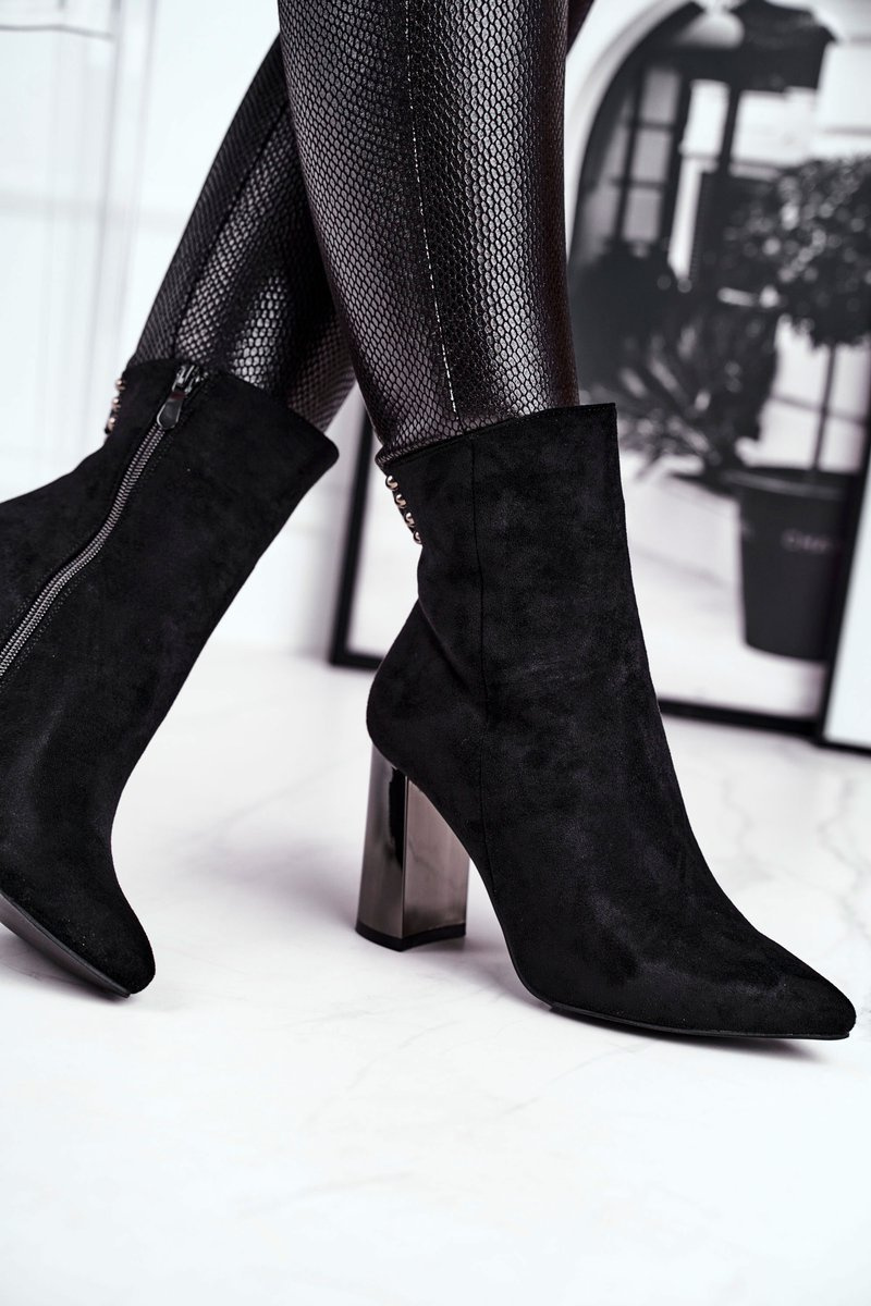 Czarne botki wykonane z przyjemnego w dotyku ekozamszu i lustrzanym obcasem to nasza nowość. Stabilny słupek oraz rozpięcie zamkiem zapewni komfort użytkowania. Rozporek w cholewce dopasowuje się do każdej tęgości, dzięki czemu będzie to doskonały wybór na jesienne czy wiosenne użytkowanie. Przy wyborze rozmiaru prosimy sugerować się tabelą rozmiarów.